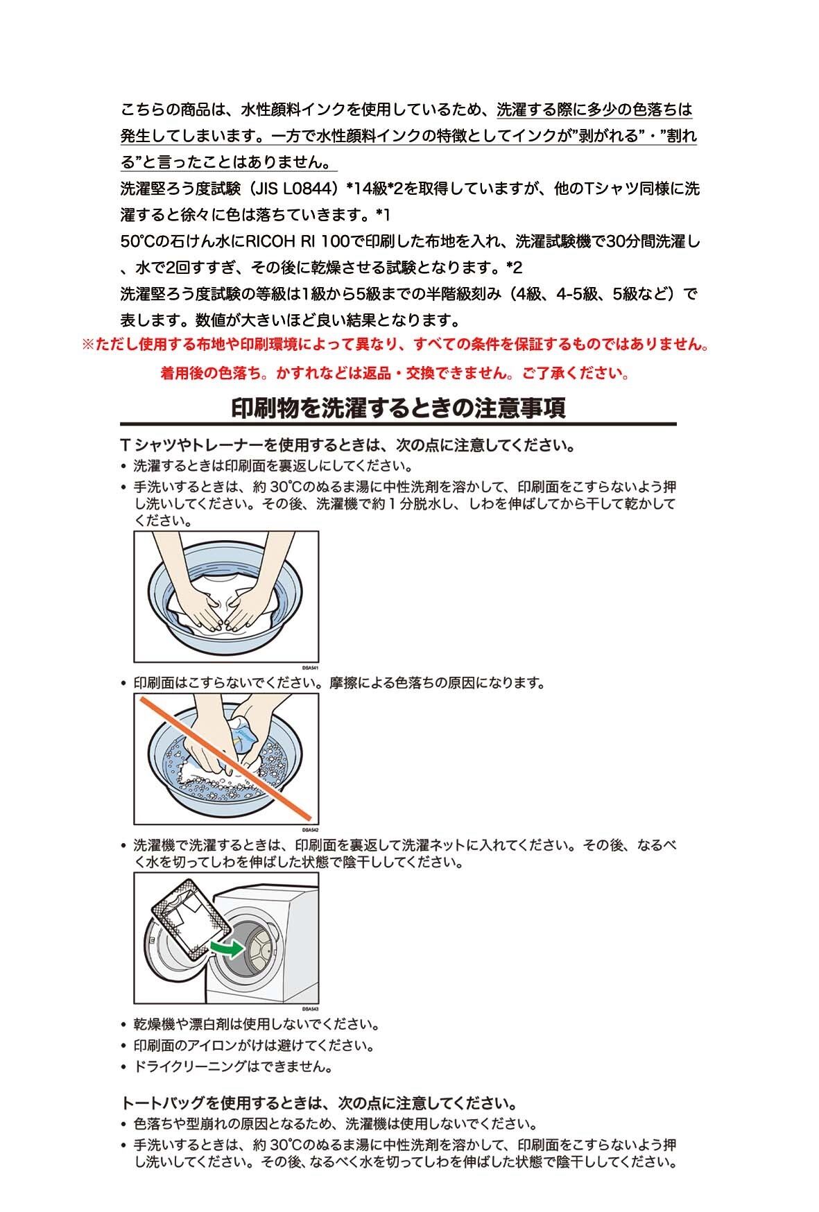 ※水性顔料インクを使用しているため、洗濯する際に多少の色落ちは発生してしまいます。一方で水性顔料インクの特徴としてインクが”剥がれる”・”割れる”と言ったことはありません。また、【洗濯堅牢性試験(JIS L0844)4級】を取得しています。ただし使用する布地や印刷環境によって異なり、すべての条件を保証するものではありません。