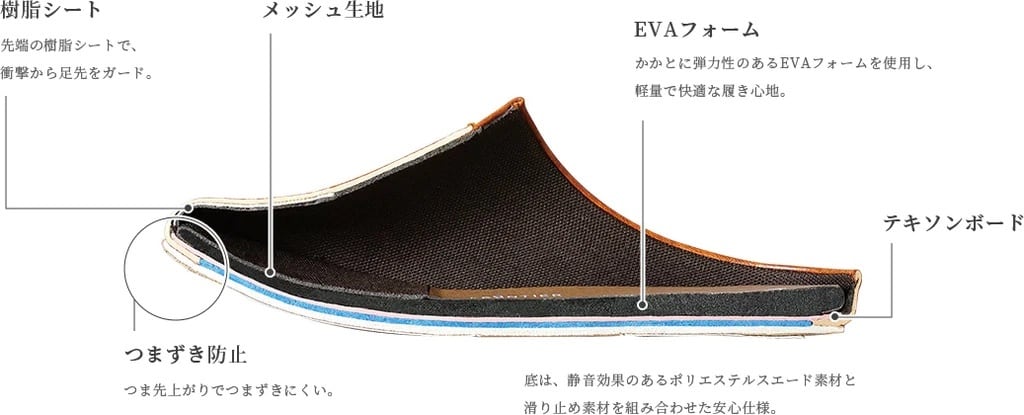 ・かかとに弾力性のあるEVAフォームを使用し、軽量で快適な履き心地。